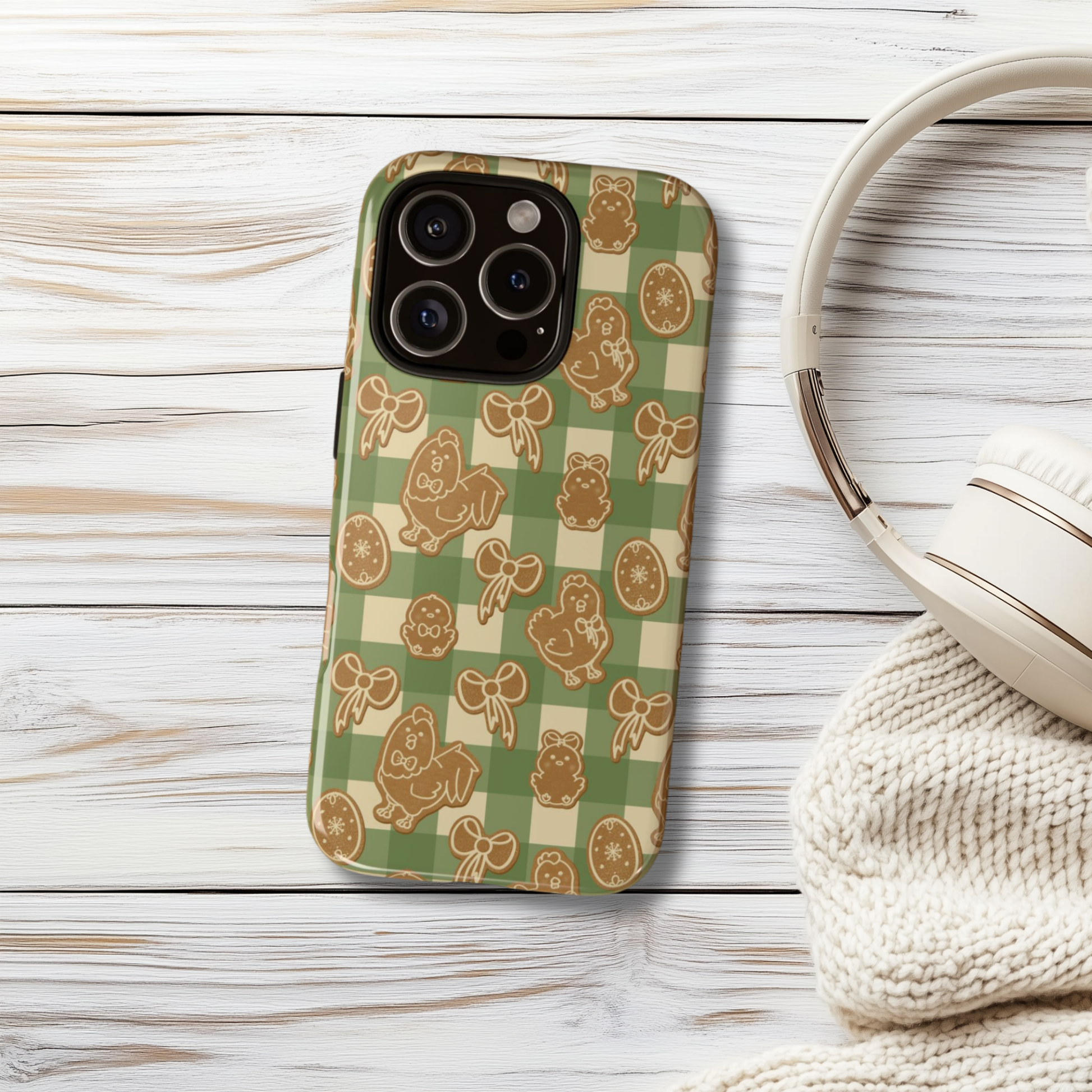 This durable phone case blends cozy nostalgia with daily protection. A warm, gingerbread pattern—little cookies shaped as chickens, bows, and eggs - repeats across a soft green gingham background for a homespun look that feels familiar and calm. The case wraps fully in high-density print so the design flows over edges and corners without interruption. Inside, a smooth TPU silicone liner cushions shocks while a rigid polycarbonate shell resists impacts and scrapes. It slips into pockets easily, keeps ports accessible, and supports wireless charging so you can move through the day without fuss. Wear it when you want your phone to feel a little more like a comforting detail in your home-away-from-home.