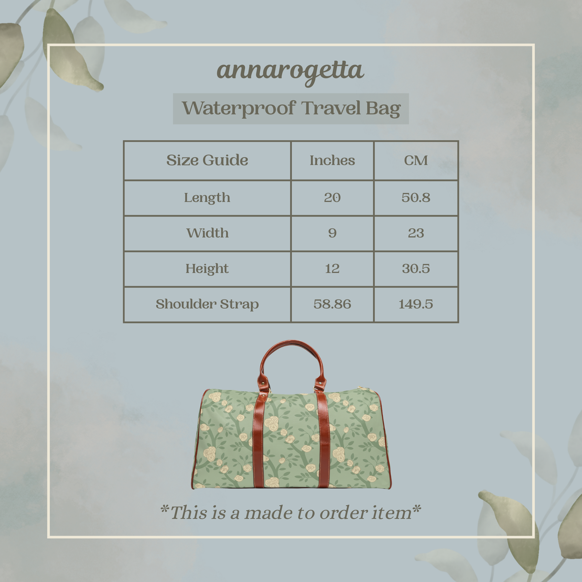 Waterproof Travel Duffel Bag | Sage Green Floral Weekend Bag | White Rose Vine Overnight Bag | Cottagecore Carry On Duffel | Gym Bag | Gift for Her