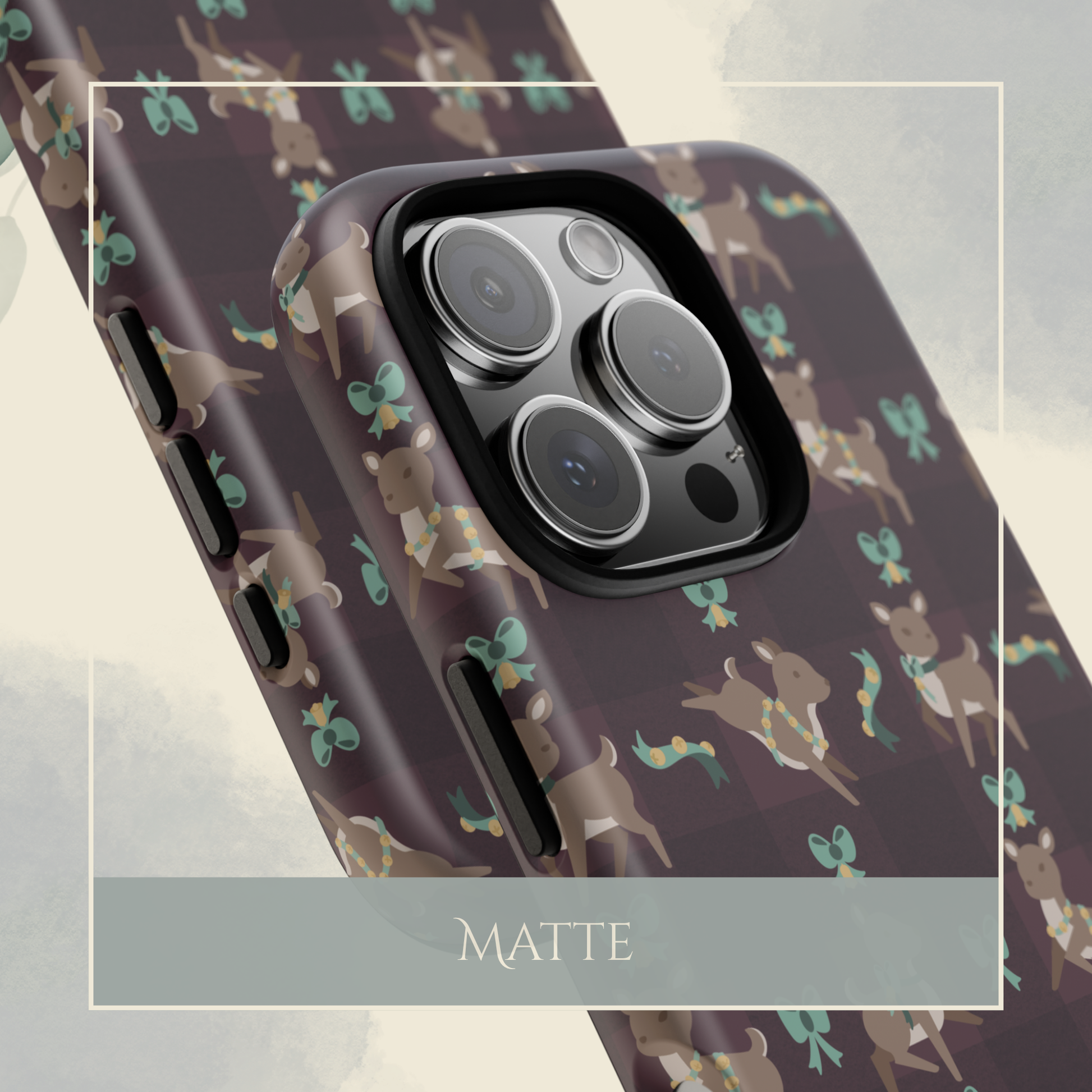 A sturdy protective phone case with a warm, cabin-inspired pattern — tiny deer and teal bows set against a rich, muted plaid. The dual-layer shell shields your phone from knocks and drops while the soft TPU liner cushions impacts. The glossy (or matte) print is fully wrapped with deep ink transfer for a seamless look that resists fading, so the cozy, woodland motif stays clear through daily use. Thoughtful details like open ports and wireless charging compatibility mean this case protects without getting in the way of how you live and move.