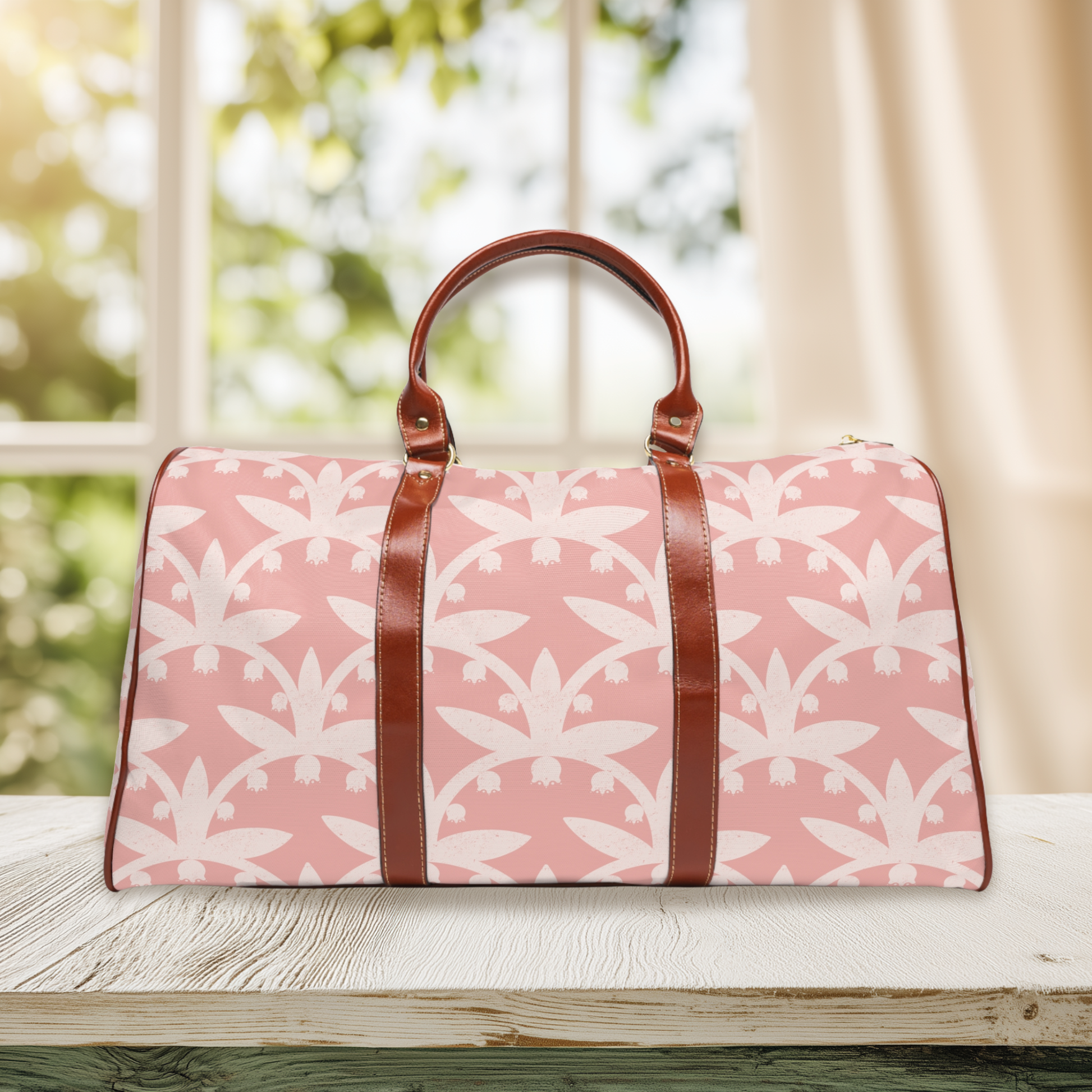 Bring a soft vintage botanical touch to your travels with this waterproof duffel bag featuring my original lily of the valley scallop pattern in a pink rose background. Inspired by classic block print and stamped textures, this design feels timeless, romantic, and perfect for spring travel.