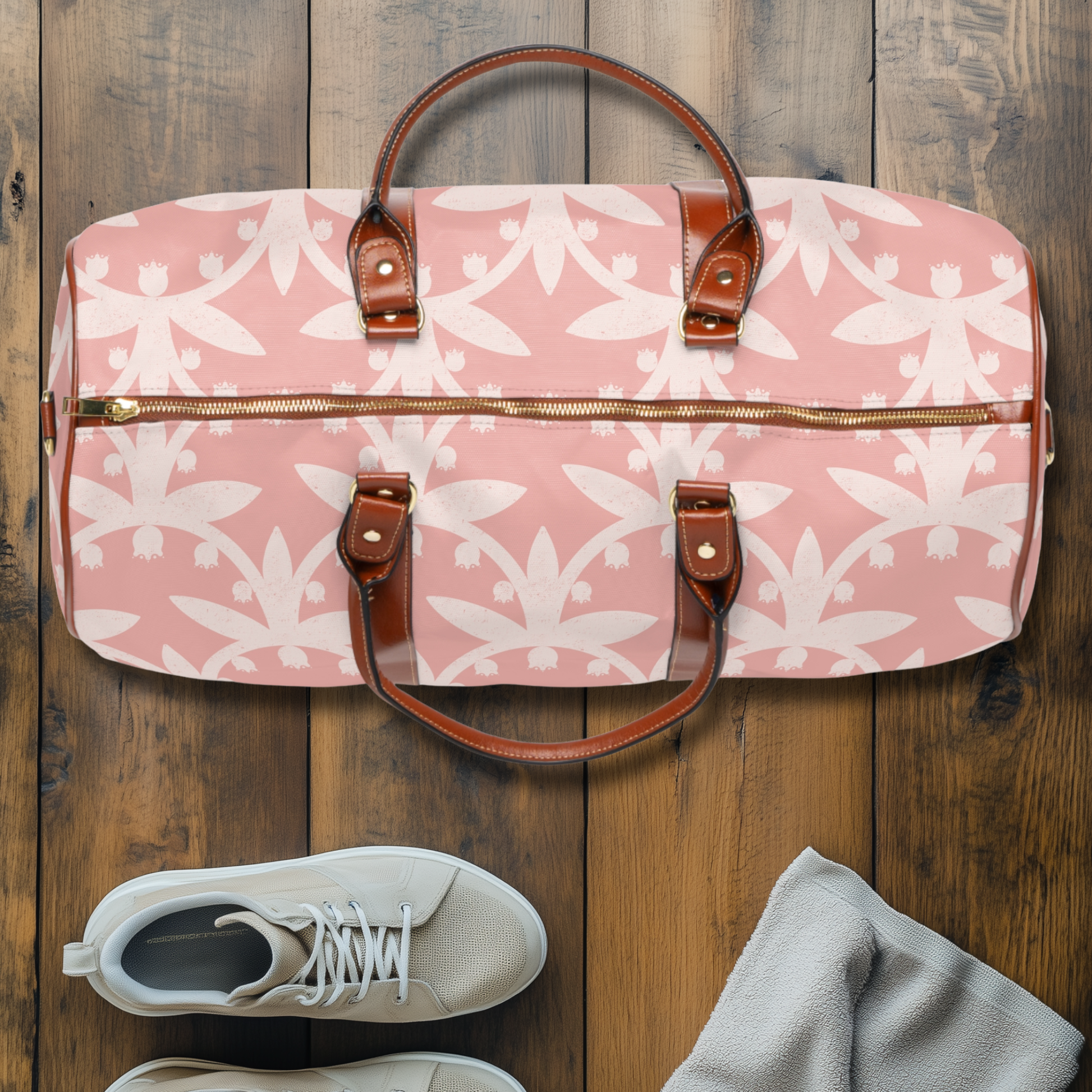 Lily of the Valley Travel Duffel Bag | Waterproof Overnight Bag | Pink Rose Botanical Scallop Pattern | Vintage Block Print Floral Weekender | Gift for Her | Spring Travel Gift