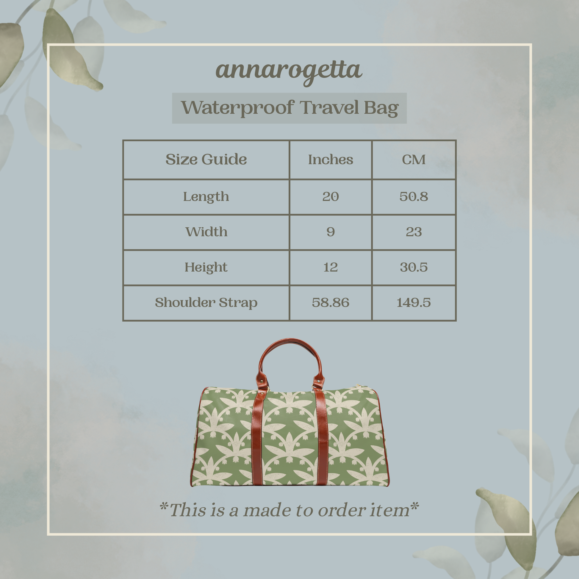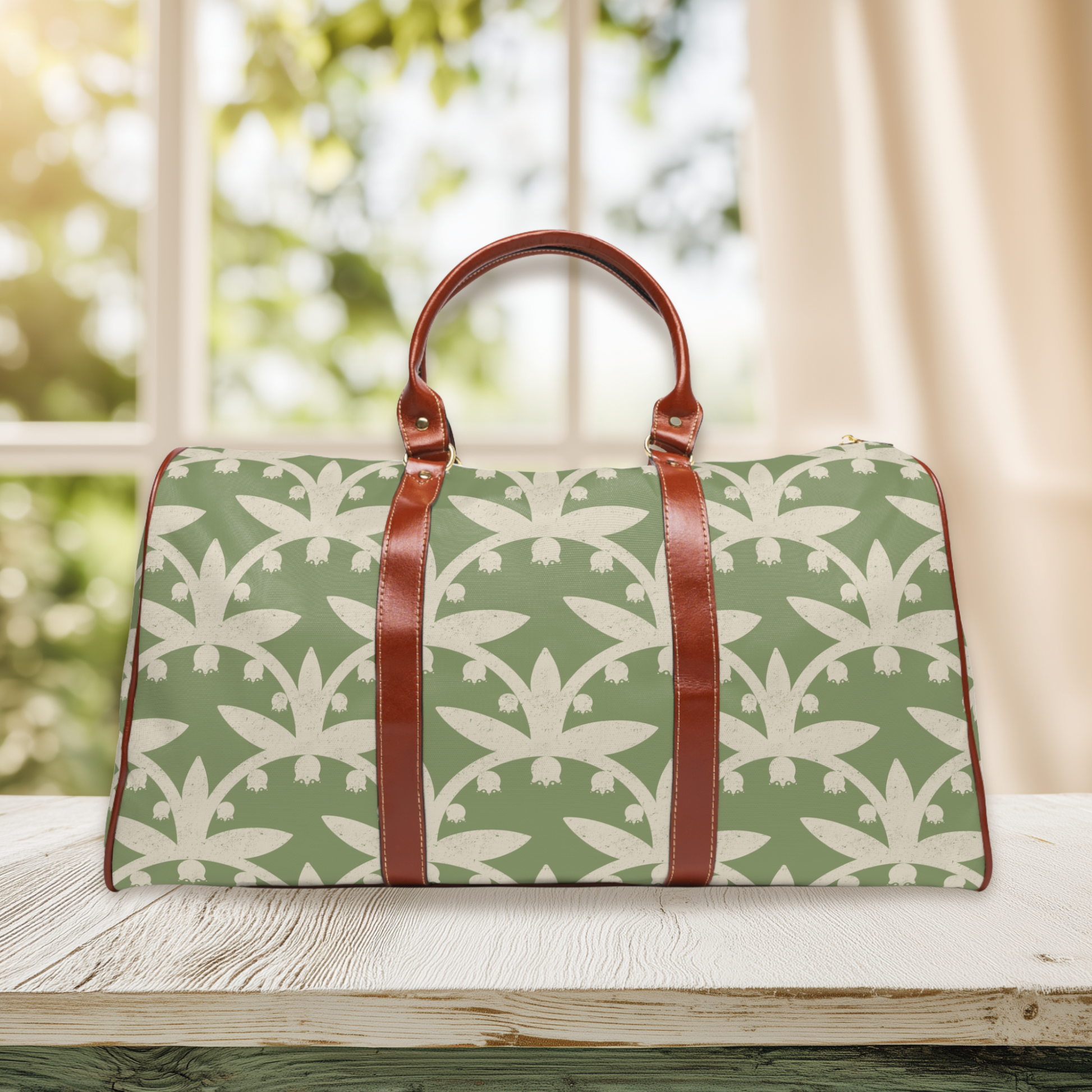 Lily of the Valley Travel Duffel Bag | Waterproof Overnight Bag | Botanical Block Print Scallop Pattern | Green Floral Weekender Bag | Gift for Travelers
