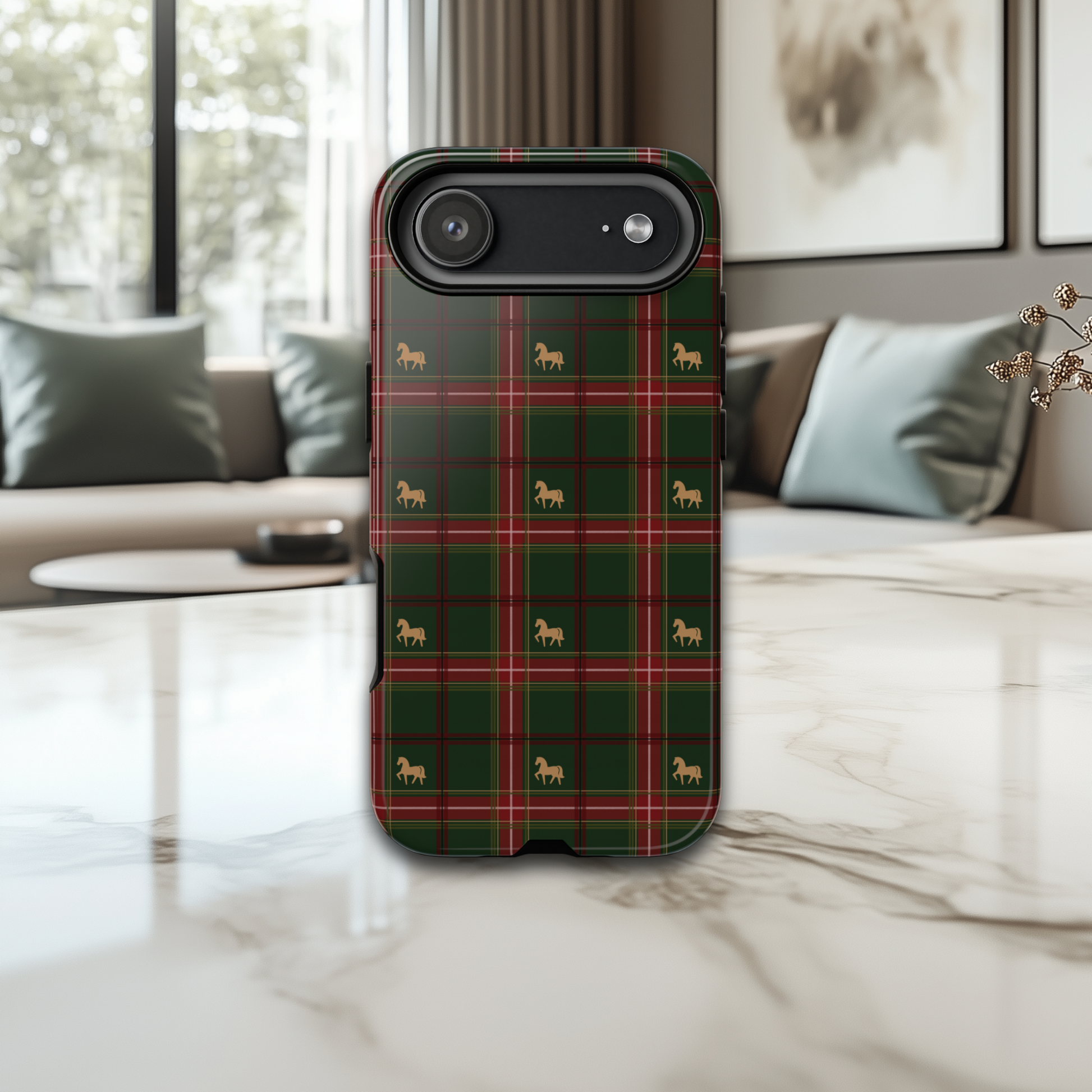 This tough phone case blends old-world tartan with a subtle, playful motif — tiny gold horse silhouettes tucked into a deep green and crimson plaid. The dual-layer shell and silicone liner cushion drops and absorb shocks while the 3D wrap keeps the pattern continuous around the edges. UV protection preserves the rich colors for outdoor use, and the glossy or matte finish options let you choose a refined sheen or a low-key look. Clear port cutouts keep charging and audio convenient, and the case supports wireless charging so daily use stays effortless. It’s a case that reads like a well-loved riding coat: familiar, quietly stylish, and built to take knocks without losing its character.