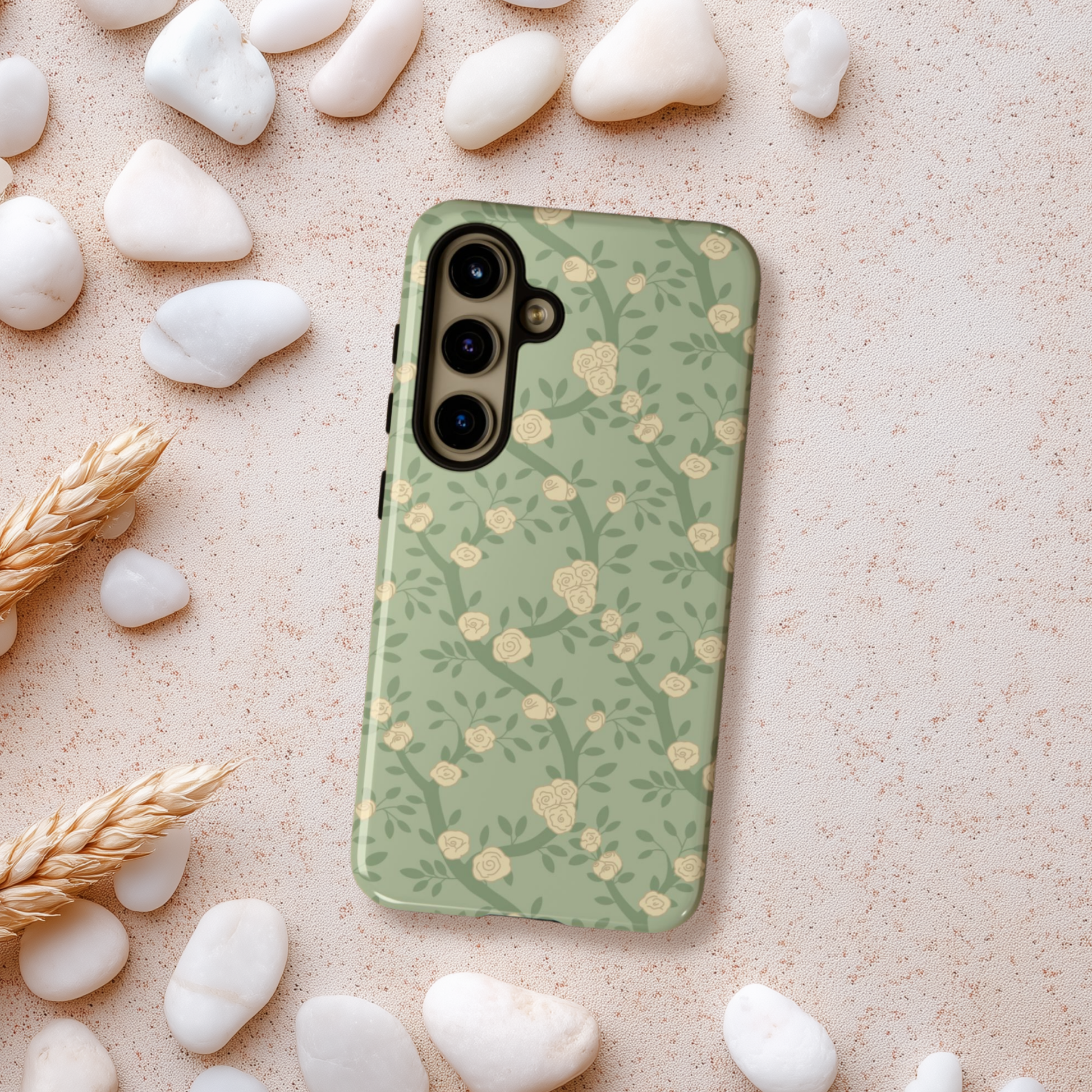 A slim yet rugged phone case wrapped in a soft vintage-green floral print. The dual-layer shell pairs a hard polycarbonate exterior with a TPU silicone liner for shock absorption, while 3D wrap printing keeps the pattern flowing seamlessly around the edges. It feels smooth in hand, resists outdoor fading thanks to UV protection, and leaves ports accessible for everyday use. Light, botanical charm meets real-world protection — a case that carries a quiet, nature-inspired look without giving up durability or wireless charging compatibility.