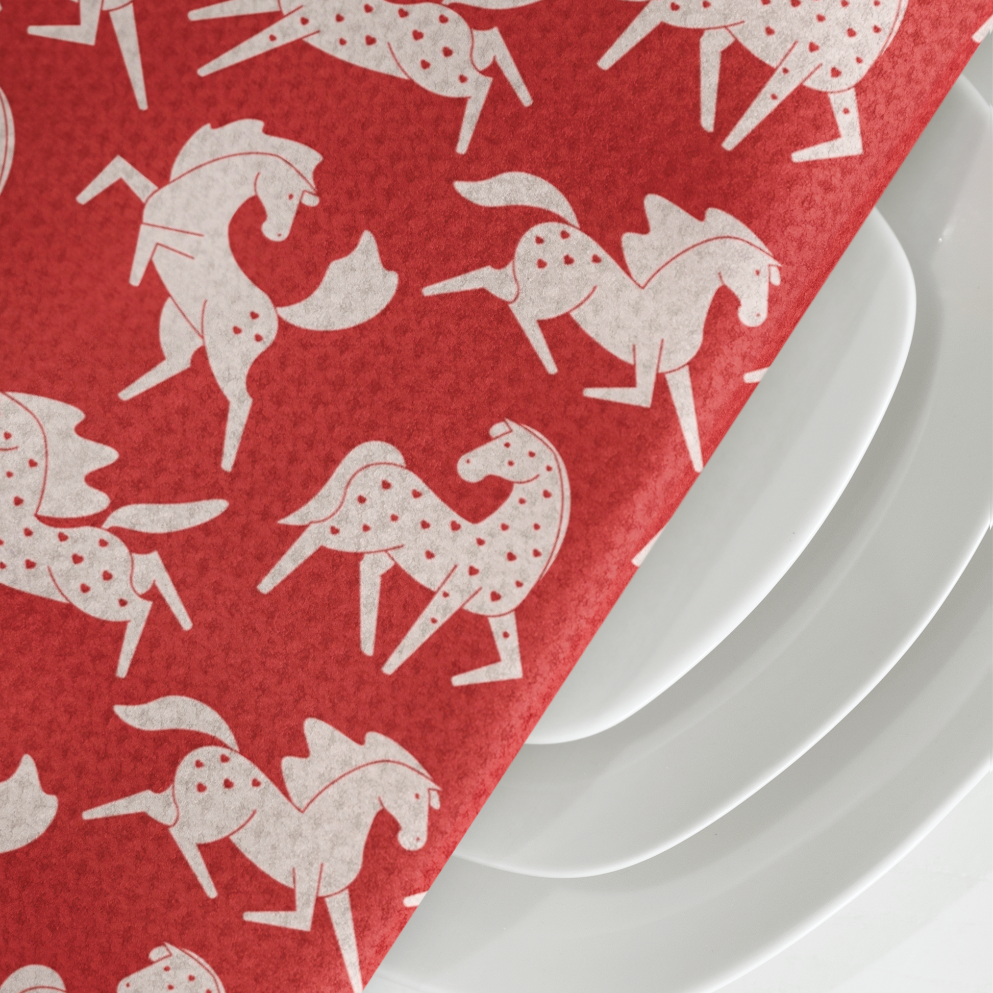 - One-sided print with vibrant, folk-style prancing-horse pattern